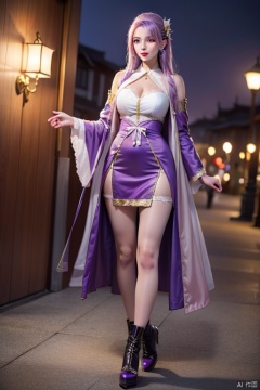 Sunshangxiang,1girl,solo,long hair,skirt,purple hair,multicolored hair,coat,pink footwear,personification,long sleeves,shoes,jewelry,gradient hair,looking at viewer,pink hair,boots,, (raw photo:1.2),((photorealistic:1.4))best quality,masterpiece,illustration,an extremely delicate and beautiful,extremely detailed,CG,unity,8k wallpaper,Amazing,finely detail,masterpiece,best quality,official art,extremely detailed CG unity 8k wallpaper,absurdres,incredibly absurdres,huge filesize,ultra-detailed,highres,extremely detailed,beautiful detailed girl,cinematic lighting,1girl,pale skin,tall female,(perfect body shape),skinny body,Slender legs, caiyi, black pantyhose
