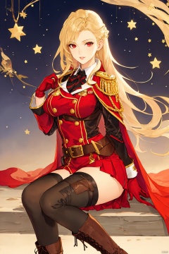 1girl, solo, long hair, breasts, looking at viewer, skirt, blonde hair, red eyes, thighhighs, gloves, boots, belt, star \(symbol\), cape, uniform, zettai ryouiki, military, red gloves, red cape