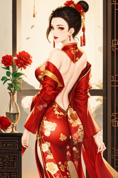 1girl, solo, breasts, looking at viewer, smile, black hair, hair ornament, long sleeves, dress, bare shoulders, brown eyes, jewelry, standing, flower, earrings, looking back, indoors, hair flower, off shoulder, hair bun, from behind, lips, makeup, rose, back, chinese clothes, floral print, red dress, single hair bun, red flower, china dress, backless outfit, red lips, bare back, backless dress, vase