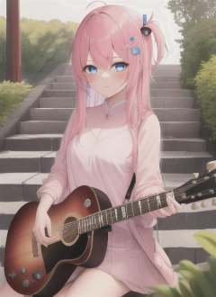 boqi,1girl,gotou hitori,((cube hair ornament)),solo,pink hair,blue eyes,<lora:boqi_20230625190201:0.4>,outdoor,On the stairs,Guitar,, masterpiece, best quality,