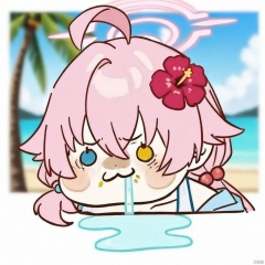 chibi,drooling,food on face,:3,(masterpiece),(best quality),solo, red flower, 1girl, hoshino (blue archive), flower, blue jacket, hoshino (swimsuit) (blue archive), hair ornament, white bikini, frilled bikini, heterochromia, swimsuit, twintails, long hair, ahoge, yellow eyes, bikini, navel, halo, blush, looking at viewer, jacket, frills, low twintails, blue eyes, open mouth, pink hair, collarbone, hair between eyes, hair bobbles, outdoors, long sleeves, hair flower, official alternate costume, hibiscus, open clothes, blurry