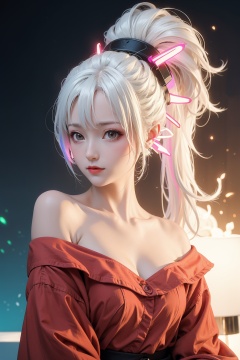 1girl,Long hair,(glowing:1.5),ponytail,fire,white hair,Off Shoulder,neon lamp,xiaowu,1 girl,