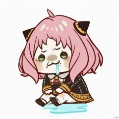 chibi,drooling,food on face,:3,(masterpiece),(best quality),Anya Forger, 1girl, anya \(spy x family\), solo, female child, pink hair, green eyes, school uniform, eden academy school uniform, smile, dress, sitting, looking at viewer, open mouth, black footwear, black dress, child, shirt, :d, long sleeves, full body, shoes, medium hair, bangs, ahoge, white pantyhose, collared shirt