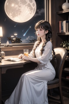 Star gazeR,1girl,solo,alone,light brown very long hair,(absurdly long hair:1.2),(1braid:1.3),(long braid, tungled braid:1.4),white night dress,star dress,looking at the viewer,in her room,book,shelf,window,box,stars in bottles,desk,chair,astronomical telescope,sitting,looking up the sky,brilliant shooting stars,(nebula, starry sky:1.3),(symbolic, dazzling, beautiful cressent moon background:1.4),breathraking,fairy tale,fantasy,pixiv,moon light,light particles,(masterpiece:1.2),best quality,PIXIV,cozy animation scenes,scenery,ultra detailed,COZY ANIMATION SCENES,starlight,star,