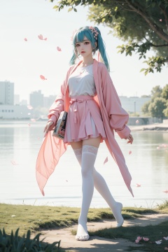 [(white background:1.5),::5] hexagon,mid shot,full body,stand,(masterpiece),(best quality),(official art, extremely detailed CG unity 8k wallpaper),(highly detailed),((absurdres)),(exquisite facial features),((miku)),((sfw)),((pink white thighhighs without shoes)),flower-shaped pupils,color contact lenses,beautiful and delicate water,the finest grass,very delicate light,nature,painting,water spray,breeze,flowers and grass meadow,near the water edge,randomly distributed clouds,falling petals,