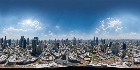 <lora:HMSG航拍全景XL:1>,360panorama,Centered Horizon,No seams,<lora:光影XL:1>,The city skyline during the day is a vibrant tapestry of architectural marvels reaching for the sky. Skyscrapers clad in glistening glass reflect the sun's rays, casting a spectacle of light and shadow on the urban canvas below. The hustle and bustle of the city are visible from this panoramic view, with cars moving like ants in the streets, and people scattered among the open plazas and green spaces. It's a snapshot of daily urban life, set against the backdrop of a clear blue sky and the promise of modernity's triumphs