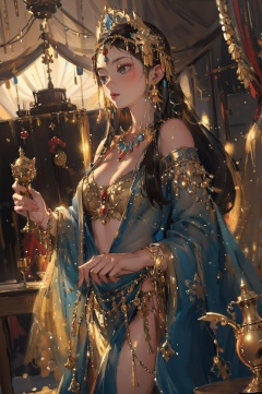 masterpiece,best quality,<lora:PDLX_西域公主:1>,Regal princess in a richly decorated tent, bejeweled headdress, and holding a golden goblet