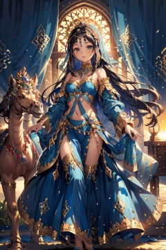 masterpiece,best quality,<lora:PDLX_西域公主:1>,The enigmatic princess stands at the helm of a camel caravan, her figure a vision in a gown of deepest indigo, embroidered with threads of gold that catch the setting sun's rays like a treasure trove of precious gems