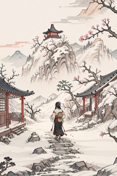 Chinese,Chinese ink wash landscape painting style,jieqi,guohuashanshui,Continuous mountain ridges,footprints,straw sandals,dusk descending,walking on the path home,a plum blossom tree flourishing on a branch,blossoming flowers,essence of spring,(best quality, 4k, 8k, highres, masterpiece:1.2),ultra-detailed,(realistic, photorealistic, photo-realistic:1.37),tranquil journey,(evening's glow:1.1),(return to warmth:1.1),(spring's arrival:1.1),(floral fragrance:1.1),(rustic beauty:1.1),(pathway to solace:1.1),(harmony with nature:1.1),(timeless landscape:1.1),(sense of belonging:1.1),(seasonal bloom:1.1),(simplicity of life:1.1),(serene ambiance:1.1),(glimmer of hope:1.1),(renewal and growth:1.1),(end of day solitude:1.1),(heartening journey:1.1),(embrace of homecoming:1.1),(symbol of perseverance:1.1),(whispers of spring:1.1),(poetic scenery:1.1), xian, chinese style, guofeng,Mythology, Chinese style, landscape painting, jzcg036, AI Ink Landscape,