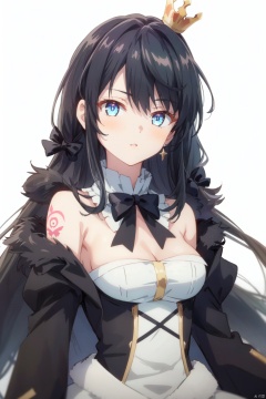 1girl, solo, eyepatch, black hair, crown, blue eyes, white background, long hair, bow, black bow, breasts, parted lips, dress, tattoo, upper body, bangs, looking at viewer, simple background, fur trim, black dress, small breasts, braid