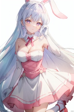 1girl, solo, dress, long hair, rabbit ears, animal ears, white background, bow, looking at viewer, hair bow, simple background, pink hair, bangs, pink eyes, pink bow, ribbon, strapless dress, gloves, bare shoulders, closed mouth, white gloves, strapless, ear piercing, frills, white dress, pink dress, breasts, red ribbon, very long hair, earrings, white footwear, pink ribbon, piercing, frilled dress