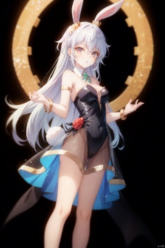 1girl, solo, animal ears, long hair, red eyes, rabbit ears, planet, earth \(planet\), crown, breasts, dress, space, see-through, bangs, very long hair, strapless, bare shoulders, white hair, looking at viewer, medium breasts, feet out of frame, bracelet, leotard, black background, floating, grey dress, thighs, strapless dress, parted lips, rabbit girl, grey hair, mini crown, see-through dress, hair between eyes, jewelry, ass, bare legs