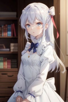 1girl, solo, dress, long hair, grey eyes, parted lips, white dress, puffy sleeves, long sleeves, breasts, grey hair, bangs, blurry background, juliet sleeves, bow, blurry, looking at viewer, small breasts, sketch