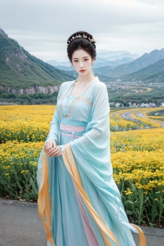 Realistic,masterpiece,best quality,8K,HDR,RAW,1girl,hanfu,((solo)),(Spring scenery, mountains in the distance, beautiful clouds, rape flower fields),(standing),large breasts,looking at viewer,<lora:add_detail:0.6>,<lora:GoodHands-beta2:1>,<lora:ENNE 氤氲国风_v4_08:1>,yinyunguofeng,