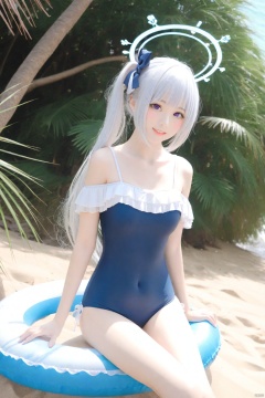 1girl, solo, (halo), bangs, long hair, sidelocks, hair flowing,  purple eyes, collarbone, swimsuit, ponytail, white hair, frills, off shoulder, one-piece swimsuit, (covered navel), alternate hairstyle, sandals, school swimsuit, innertube, blue one-piece swimsuit, frilled swimsuit, miyakoSwimsuit, ocean,beach, tree, beach_umbrella,water,sand,sunlight, parted_lips, smile, blush, looking_at_viewer, sitting, loli, cowboy_shot,