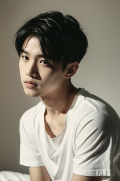 1boy,asians,Camera film style,a young individual, possibly male, with short black hair, gazing intently to the side. He wears a plain white t-shirt and is set against a muted background, possibly a bedroom or a quiet indoor setting. The lighting is soft, casting subtle shadows and highlighting the contours of his face, masterpiece,best quality,