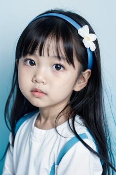 child photography,1girl,asians,Camera film style,child,young,white shirt,messy hair,blue background,makeup,(looking to the side:1.1),serious expression,portrait,, masterpiece,best quality,