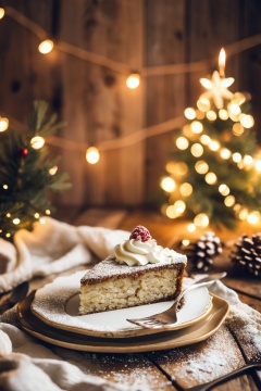 Food photography, a delectable slice of cake or dessert, garnished with a golden-brown caramelized top layer, white whipped cream, and sprinkled with powdered sugar. It's presented on a rustic plate with a vintage fork beside it. The backdrop features a warm, cozy setting with a beige fabric, a couple of pinecones, and a string of fairy lights, giving off a festive ambiance, masterpiece,best quality,