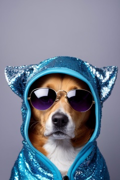Animal Photography,a dog dressed in an elaborate ensemble. the dog is wearing a shimmering hoodie with a deep blue background. the hoodie is adorned with intricate patterns and designs,and it's layered over a vibrant and colorful jacket. the dog's face is framed by a pair of golden-tinted sunglasses,giving it a confident and stylish appearance. the backdrop is a gradient of deep blue,emphasizing the subject,, masterpiece,best quality,