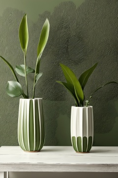 Still life photography, two wooden vases placed side by side on a white surface. Each vase has a unique, slightly elongated shape and is adorned with a series of intricate grain patterns. Positioned in the vases are two large, green leaves, each with broad, glossy surfaces and distinct veins. The leaves are attached to thin, green stems. The background is a neutral gray, allowing the vases and leaves to stand out prominently, masterpiece,best quality,