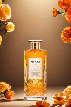 product photography,a vibrant orange perfume bottle labeled 'Nirvana' with the brand 'Rever' written above it. Surrounding the bottle are several fresh flowers in shades of orange and yellow,with their petals intricately detailed. The background is a muted beige,and the entire composition exudes a sense of elegance and nature,, masterpiece,best quality,