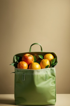 product photography, a vibrant green bag filled with various citrus fruits, including oranges, lemons, and limes. The bag is set against a draped green backdrop with sunlight casting a warm glow, creating a serene and fresh ambiance. The fruits are positioned around the bag, with one of the oranges cut open, revealing its juicy interior. The entire composition exudes a sense of luxury and freshness, masterpiece,best quality,