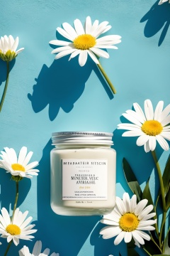 product photography, This image captures a serene and ethereal scene of a jar filled with a creamy substance, surrounded by a myriad of white daisies. The jar appears to be placed on a rocky surface amidst a backdrop of trees and clear blue skies. As the jar is gently tilted, a few daisy petals seem to be floating away, creating a sense of tranquility and natural beauty, masterpiece,best quality,