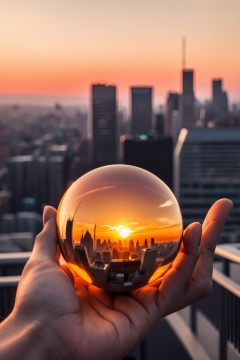 Still life photography,A person's hand gently holds a clear glass sphere,within which a city skyline is captured during sunset. The sun casts a warm orange hue over the buildings,creating a serene and reflective ambiance,, masterpiece,best quality,