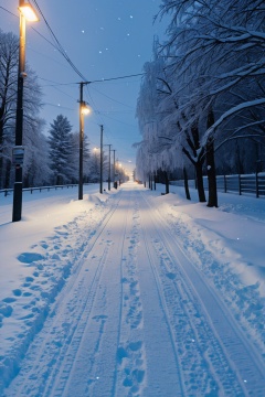 Landscape photography,a serene winter evening in an urban setting. Snow blankets the ground,with trees laden with snow on either side. Illuminated street lamps cast a warm glow,creating a contrast with the cool,blue hue of the night. The pathway is untouched by footprints,save for a solitary figure walking in the distance. The scene evokes feelings of tranquility,nostalgia,and the magic of winter,, masterpiece,best quality,