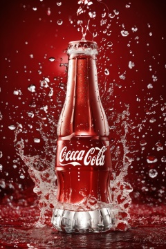 Still life photography, a Coca-Cola bottle with water droplets cascading around it, creating a dynamic splash against a vibrant red background. The bottle's cap is intact, and the brand's logo is prominently displayed on the label, masterpiece,best quality,