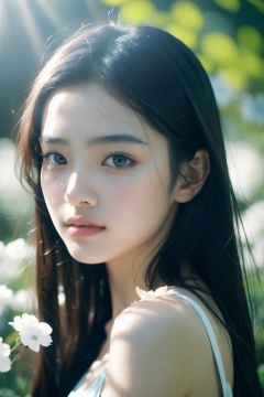 1girl,asians,Camera film style,A young woman with dark hair and intense eyes is captured in a close-up, holding a bouquet of delicate blue flowers. The sunlight filters through the petals, casting a soft glow on her face and creating a dreamy ambiance. The background is blurred, allowing the viewer to focus solely on her., masterpiece,best quality,
