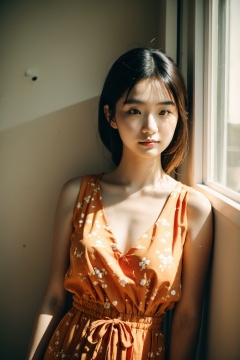 Camera film style,1girl,a asians young woman,possibly in her twenties,standing near a window. She is wearing an orange top with a floral pattern and a white dress. The sunlight illuminates her face,casting a warm glow. She has her eyes closed,possibly enjoying the sunlight or lost in thought. The setting appears to be indoors,with wooden furniture visible in the background,, masterpiece,best quality,