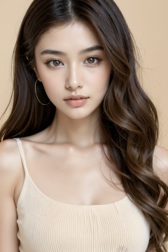 (Camera film style:1.1),1girl,asians,a young woman with long,wavy brown hair. She has a calm and serene expression,and her eyes are accentuated with makeup,especially around her eyes. She is wearing a beige knitted sweater over a white **** top. The background is plain and light-colored,which emphasizes her features,, masterpiece,best quality,
