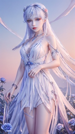 cr,1girl,solo,white dress,white hair,long hair,hair ornament,jewelry,red eyes,looking at viewer,hair_ornament,metal hair accessories,blue_dress,flower field,sunset,blue_sky,,pink rose,cowboy_shot,<lora:玫瑰花场景-王导:0.6>