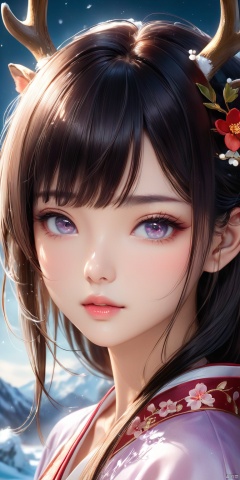 HD, CG, extreme details, fairy style, fisheye lens, exquisite facial features, clear pupils, moist lips, ((4k,masterpiece,best quality)), professional camera, 8k photos, wallpaper, (masterpiece), top CG Picture quality, ultra-clear, high-resolution, highest quality, relief art, three-dimensional sense, extraordinary beauty, stunning girl, black hair, soft hair, (exquisite hair depiction), (white jade cute little antlers), ( Exquisite facial features description), bright beautiful eyes, (exquisite eye description), reddish cheeks, straight nose, light-colored small lips, ink plum blossom Hanfu, perfect body, close-up, perfect collarbone, (silk Shawl), ice and snow, glaciers, beauty, super details, moonlight, sense of fragmentation, vertical painting, reasonable light and shadow