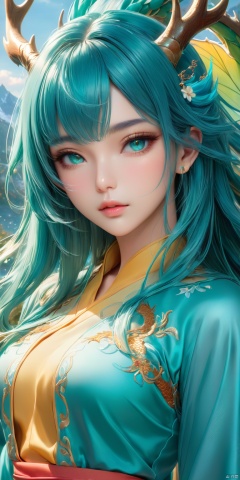 HD, CG, extreme details, fairy style, fisheye lens, exquisite facial features, clear pupils, moist lips, ((4k,masterpiece,best quality)), professional camera, 8k photos, wallpaper, 8K resolution, best quality (Masterpiece), best quality, stunning woman, youthful and beautiful beauty, (bishoujo), masterpiece, best quality, official art, extremely detailed CG, 8k wallpaper, game_CG, highest quality, ((Beauty) ), ((beautiful facial features)), (long turquoise hair), small and exquisite (((antlers))), exquisite and beautiful face, beautiful eyes, ((turquoise pupils)), ( (Sharp eyes)), delicate and small nose, ((charming light-colored lips with gloss)), good figure, ((heroic appearance)), ((turquoise silk embroidered tight-fitting Hanfu)), ((embroidered training clothes)), (turquoise silk embroidered Han pants), (dragon wrapped around)), (slender dragon tail)), (turquoise embroidered dragon cloak)), (majestic background) , 8K resolution, (masterpiece), best quality
