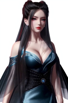 ((HRD, HUD, 8K)),((masterpiece, best quality)), highly detailed, 1girl, solo, black hair, long hair, lips, red lips, makeup, breasts, cleavage, earrings,bare shoulders, dress, blue dress, simple background, white background,upper body, standing, looking at viewer, <lora:20240518-1715992227646:0.73>