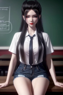 ((HRD, HUD, 8K)),((masterpiece, best quality)), highly detailed, 1girl, solo, black hair, long hair, lips, red lips, makeup, (white shirt:1.2), necktie, denim shorts,blurry background, classroom, chalkboard, sitting, cowboy shot, looking at viewer, <lora:20240518-1715992227646:0.7>