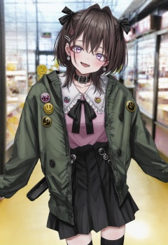 masterpiece, best quality,1girl, ribbon, solo, black ribbon, skirt, jacket, black skirt, thighhighs, hair ornament, looking at viewer, blush, hair ribbon, shirt, photo background, black thighhighs, green jacket, badge, jewelry, earrings, frills, open mouth, black hair, collar, neck ribbon, smile, purple eyes, bag, cowboy shot, pink shirt, button badge, hair intakes, medium hair, hairclip, jirai kei, long sleeves, smiley face, bangs, pink eyes, fang, brown hair, open clothes, hair between eyes  <lora:GUXLlokr8f-000183:0.95>