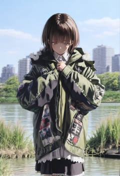 masterpiece, best quality,1girl, solo, outdoors, brown hair, photo background, jacket, short hair, day, brown eyes, building, river, sky, closed mouth, hood, green jacket, looking down, long sleeves, standing, bangs, hood down, water, skirt, grass, blue sky <lora:GUXLlokr8f-000183:0.95>