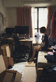 masterpiece, best quality,1girl, electric fan, solo, short hair, indoors, sitting, messy room, chair, window, curtains, cardboard box, bed, hand fan, bedroom, box, desk, computer, brown hair, black hair, office chair, shorts, scenery, air conditioner <lora:GUXLlokr8f-000183:0.95>