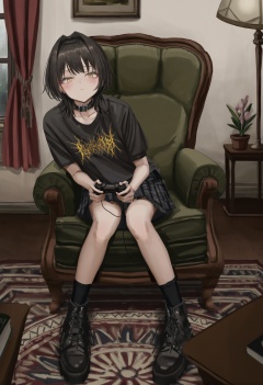 masterpiece, best quality,1girl, solo, shirt, black shirt, sitting, skirt, collar, controller, chair, yellow eyes, indoors, curtains, holding controller, plant, blush, rug, black skirt, boots, bangs, medium hair, potted plant, plaid skirt, black collar, belt collar, black footwear, plaid, black socks, holding, looking at viewer, pleated skirt, black hair, short sleeves, closed mouth, hair intakes, lamp, full body, socks, carpet, window, armchair, game controller, ankle boots, miniskirt, t-shirt, on chair  <lora:GUXLlokr8f-000183:0.95>
