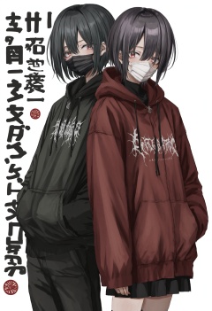 1girl, 1boy, kirishima touka, kaneki ken,   short hair, black hair, red eyes, hair over one eye, thighhighs, mask, white background, hand in pocket, simple background, looking at viewer, hood, jacket, alternate costume, parted bangs, hands in pocket, mouth mask, copyright name, frown, brown eyes, eyelashes, masterpiece, best quality <lora:GUXLlokr8f-000183:0.95>