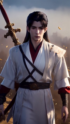 fh,solo,1boy,long hair,male focus,realistic,weapon,sword,black hair,river,grass,wonderland,fog,exquisite facial features,delicate skin,bright,Cinematic Lighting,looking_at_viewer,day,,well lit,depth of field,facial polishing,cowboy shot,robe,dynamic_pose,((surrounded by heavy floating sand flow and floating sharp stones)),((((ink)))),((illustration)),((watercolor)),weapon_on_back,<lora:玫瑰花场景-王导:0.6>