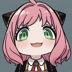 big-head, chibi,portrait,:3,(masterpiece),(best quality),Anya Forger, 1girl, anya \(spy x family\), solo, female child, pink hair, green eyes, school uniform, eden academy school uniform, smile, dress, sitting, looking at viewer, open mouth, black footwear, black dress, child, shirt, :d, long sleeves, full body, shoes, medium hair, bangs, ahoge, white pantyhose, collared shirt