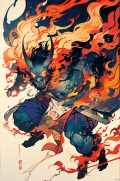solo, long hair, open mouth, red eyes, 1boy, full body, male focus, horns, teeth, glowing, colored skin, fangs, fire, sharp teeth, glowing eyes, pelvic curtain, colored sclera, oni horns, oni, loincloth, demon, traditional youkai,cmwl