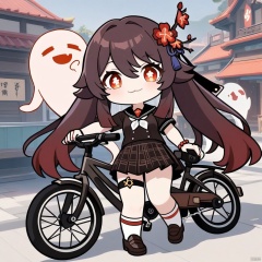 big-haed,chibi,:3,masterpiece, best quality, 1girl, hu tao \(genshin impact\), ground vehicle, twintails, red eyes, bicycle, brown hair, hair ornament, skirt, looking at viewer, symbol-shaped pupils, long hair, solo, hair flower, flower, boo tao \(genshin impact\), smile, school uniform, outdoors, ghost, boat, shirt, bag, short sleeves, holding, watercraft, shoes, plaid, alternate costume, thigh strap