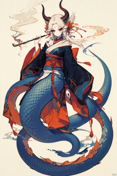 1girl, solo, looking at viewer, hair ornament, red eyes, long sleeves, holding, bare shoulders, tail, full body, japanese clothes, horns, wide sleeves, kimono, off shoulder, sash, obi, monster girl, pale skin, scales, smoking pipe, lamia,cmwl