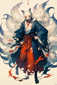 solo, long hair, looking at viewer, long sleeves, 1boy, animal ears, jewelry, standing, tail, full body, white hair, male focus, japanese clothes, barefoot, kimono, fingernails, torn clothes, fox ears, mask, fox tail, facial mark, multiple tails, hakama, rope, claws, colored sclera, sharp fingernails, magatama, shimenawa, fox mask, white fur, kitsune, kyuubi,cmwl