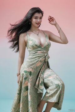 (masterpiece, best quality, ultra high res, photorealistic, realistic, raw photo, real person, photograph), (amazing, finely detail, an extremely delicate and beautiful,oncept art), intricate detail, professional, official art,1girl, long curly hair, thigh, full body, Sexy, summer dress, (floral print,sparkly:1.2), mellow, big Chest, big, butt, (modern fashion background:1.2), studio, luxury, gorgeous, JoJo pose, Rings, earrings, necklace, bangle, closed smile,(neon:1.2), Low shutter, most beautiful artwork in the world, aesthetics, atmosphere, dynamic Angle,